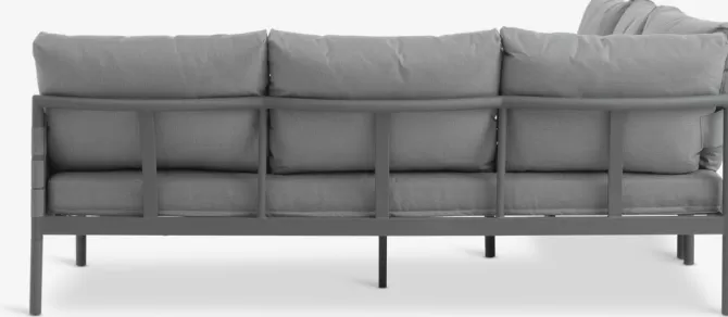 5-personers loungesæt. Bord: Aluminium og DURAWOOD® komposittræ. DURAWOOD® er et slidstærkt sammensat materiale, bestående af FSC®-hårdttræsfibre og plast. B86 x L86 x H39 cm. 5-personers sofa: Aluminium og UV-beskyttet polypropylen. Kan ikke spejlvendes. Inkl. luksushynder med slidstærkt, strukturvævet betræk.