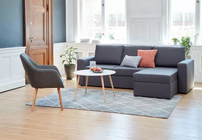 Stof. Sæde- og ryghynder i skum. Ben i massiv eg. B66 x H84 x D68 cm