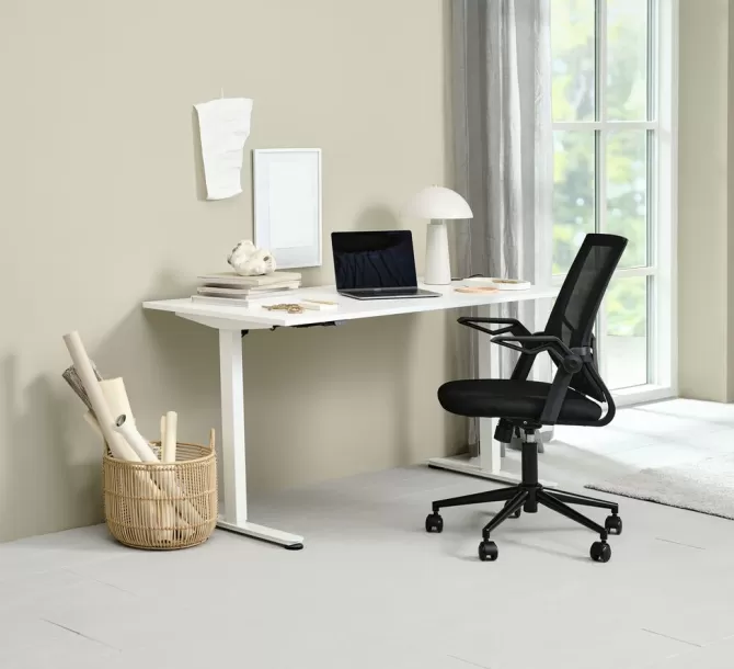 Stof og mesh. Stel i metal. Med lændestøtte, flip-op armlæn, justerbar højde og trinløs vippefunktion. B59 x H95-107 x D61 cm